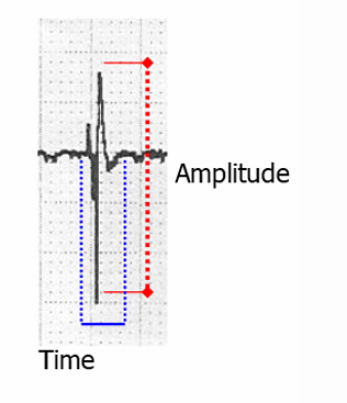 amplitude: 진폭: 파형의 최고점과 기준선 사이의 전압 차이 (단위: mV )
