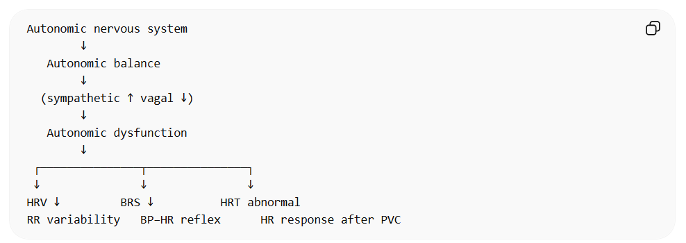 | HRV | Heart Rate Variability | 심박수 변동성 | RR interval variability | autonomic modulation | autonomic modulation of sinus node |