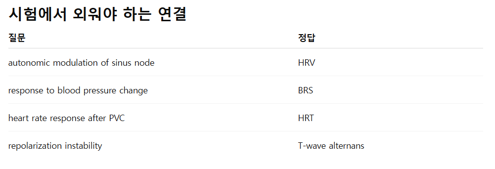 | HRT | Heart Rate Turbulence | PVC 이후 심박수 반응 | HR change after PVC | baroreflex response | after premature ventricular contraction |